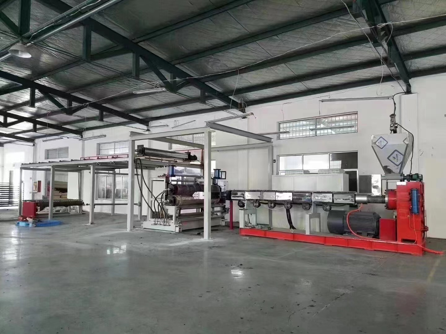 Main components of extrusion equipment: Extruder -Quick screen changer -Solution metering pump-Sheet extrusion die-Three-roll calender-Edge trimming device/Cooling and shaping bracket-2 Roller Tractor -Cut-to-length output unloading or rewinding machine.
